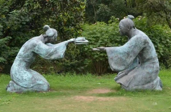 夫妻之间,过去讲求相敬如宾。“举案齐眉”这个成语,出自《后汉书·梁鸿传》,说的是东汉人梁鸿和孟光的爱情故事。妻子孟光长得又丑又肥,皮肤还黑,但是呢,她对老公梁鸿非常尊重体贴,给他送饭时把托盘举得跟眉毛一样高。这是古代一个很著名的故事,表明了夫妻之间互相尊敬的关系。这个关系在中国古代社会一直是延续的、延用的,它不是客套,它是一种关系。