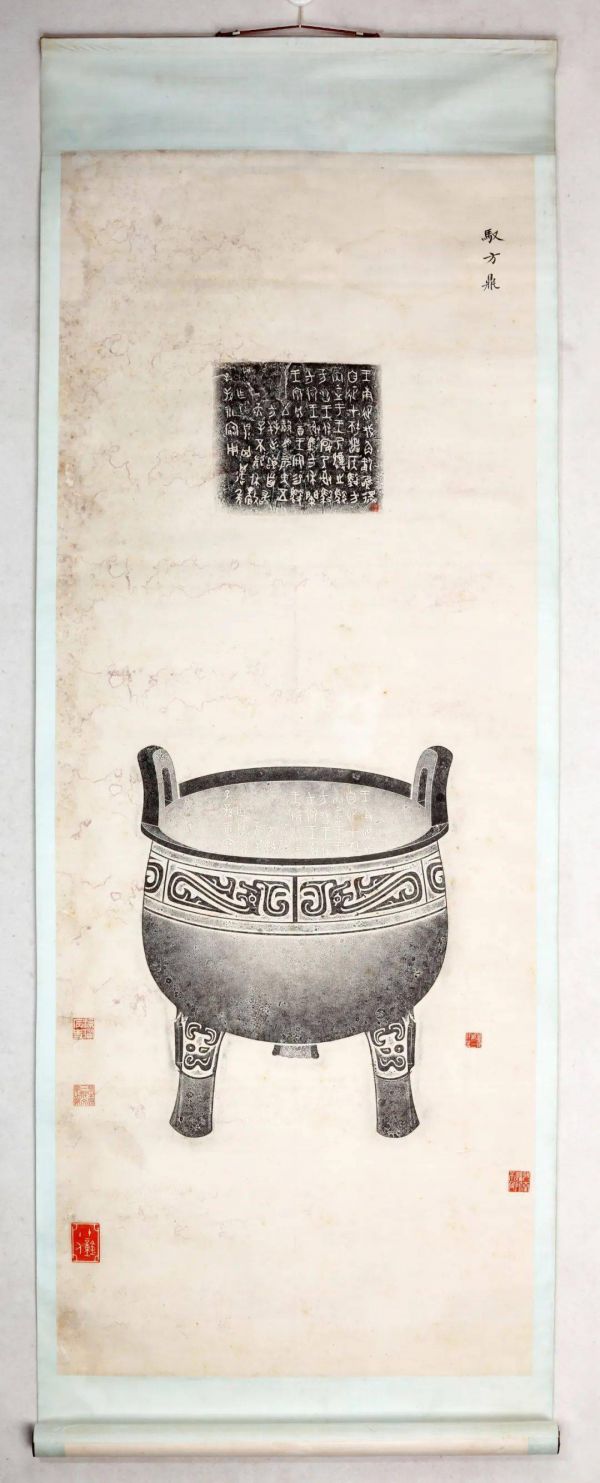 与“丮觥”相比,另一些商周铜器全形拓虽然没有题跋,但仍系名家鉴藏监拓,据之可窥一时金石风尚和传拓“家法”。如晚清金石学领域的集大成者陈介祺旧藏鄂侯驭方鼎之拓本,钤盖有他的五方印章:“簠斋藏三代器”、“收秦燔所不及”、“海滨病史”、“平生有三代文字之好”、“十钟主人”。这表示拓本至少出自由其指导且受其认可的拓工之手;拓本上部铭文则钤有“诵孙”小印,是经陈介祺友人、内阁学士吴式芬赏鉴者。作为自觉参与传拓实践、总结传拓方法、改良传拓技艺的金石收藏家和学者,陈介祺还曾撰写过《传古别录》,而其手拓或监拓的金石拓本,则直接体现了陈氏的“传古”思想和审美。应当注意,鄂侯驭方鼎拓本器形和纹饰呈现准确,墨色匀称、别其浅深,对绘画技法有所吸收和借鉴,已见黄士陵等极见西洋画法拓式之先声。