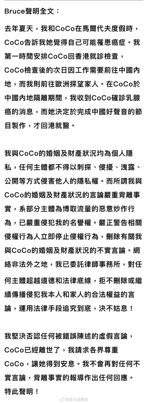 #李玟老公再发声明# 李玟老公Bruce再发声明表示李玟与自己在马尔代夫度假时,她告诉自己有可能身患癌症,之后自己安排李玟回港检查,并在隔离期间收到李玟确诊癌症的消息。自己与李玟的婚姻和财产状况皆为隐私,要求侵权主体方立即停止侵权行为,#李玟老公称不再回应任何不实言论# 请求各界尊重CoCo,让她得到安息。