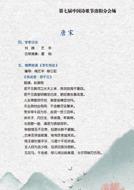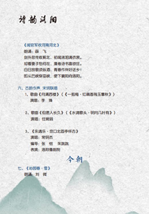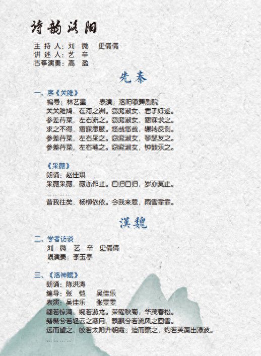 诗会精选《关雎》《采薇》《洛神赋》等名家大作,以诗歌形式讲述洛阳这座古老城市的文化内涵和丰厚底蕴;以清雅悠远古琴为伴奏,再现诗坛“双子星”李白杜甫相会的盛景;精选《永遇乐·京口北固亭怀古》《沁园春·雪》《英雄赞歌》等诗篇,展现壮阔豪迈的凌云之志和舍生忘死爱国之情;精当代洛阳诗歌《洛阳声音》《二乔》《我心飞翔》《故乡》《逐梦河洛间》等,展现洛阳诗坛风采和河洛儿女奋发向上、追求进取的精神风貌。