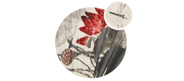 荷花是文人画中一个常画常新的题材,清华大学艺术博物馆藏齐白石所绘《荷花》成扇。红荷以疾笔、重彩勾染,色泽浓艳逼人;荷叶逸笔泼写,以浓淡、干湿五色之墨写叶纹和藕茎;莲蓬、嫩叶寥寥几笔便勾染得当;正有一只蜻蜓欲立其上,满纸生动,似有荷香拂面。有如“清光生翠影,菡萏满池香”之感,也正和“红花墨叶”的标准范式。题款“白石老人作”;钤“白石老人(白文)”。此扇无年款信息,依绘画风格与题款字体等综合信息符合齐白石盛期花鸟画的特征。