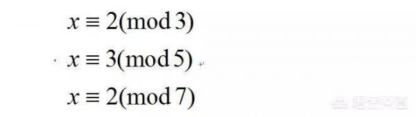 这样,韩信点兵问题就可以表示为数学语言了。有一个数字x,除以3余2,除以5余3,除以7余2, 那么这个数字是多少?数学写法是
