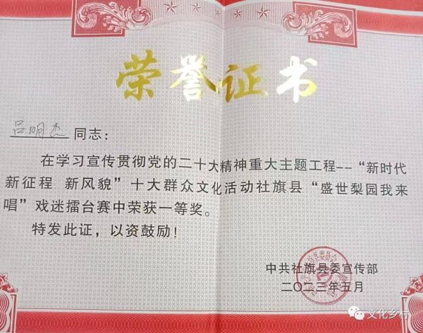 吕明杰博闻强记,学识渊博,处世老练,为人和善,他不仅教人学曲艺,也教人学做人,弟子们沐浴教泽,受益多多。弟子小莉就是跟从吕老师得到教益最多的人之一。她说:“我是在2022年开始接触大调曲的,那时我老公因病去世,我猛地接受不了,出现了精神失常,经人介绍,我加入了吕老师的曲艺学习小团队。刚开始我啥也不会唱,张不开口,因为我五音不全,吕老师就让我学弹三弦,耐心指导,不厌其烦地纠正,一遍又一遍教。现在又学唱了几句大调曲,因发音不对,吕老师耐心地教,一句能纠正无数次,从没有嫌烦过。吕老师 和蔼可亲,平易近人,谁有什么不顺心的事,他三言两语就把人心扭转过来,因此,受到了许多人的尊敬。我通过学习大调曲以及受到吕老师的思想开导,心情好多了,也从阴影中走了出来,我非常感恩老师,是他和他的曲艺救了我。”