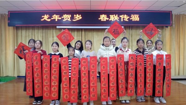 随后,“小书法家”们满载热情、笔走飞龙,一个个汉字在他们的笔下或劲健或婉转,或如婀娜窈窕的美人,或如矫健勇猛的壮士,一幅幅充满喜庆、吉祥、祝福的春联随笔而出。