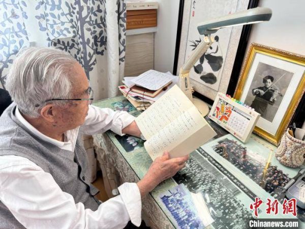 图为石永在采访中翻阅书籍并哼唱。陈宗淇摄