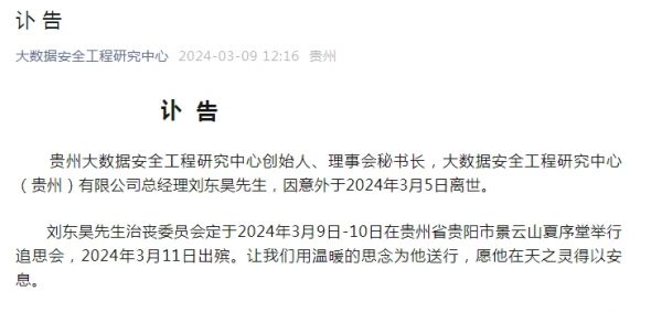 据“大数据安全工程研究中心”微信公众号3月9日消息,贵州大数据安全工程研究中心创始人、理事会秘书长,大数据安全工程研究中心(贵州)有限公司总经理刘东昊,因意外于2024年3月5日离世。