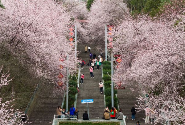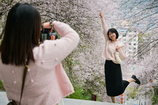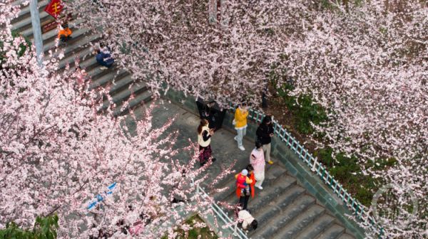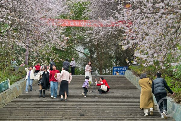 随着天气回暖,黔江区西山公园的红叶李迎来盛花期。一簇簇粉色的花朵挂满枝头,形成一道靓丽的风景,吸引了大批市民前来游玩,人们纷纷在树下拍照赏春,享受春日的美好时光。