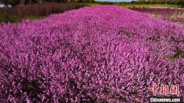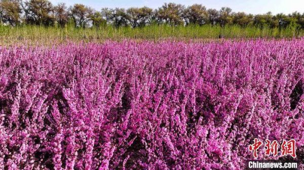 眼下,在新疆吐鲁番市托克逊县郭勒布依乡肖尔村的林海园林花圃,上百亩榆叶梅盛放,美不胜收。