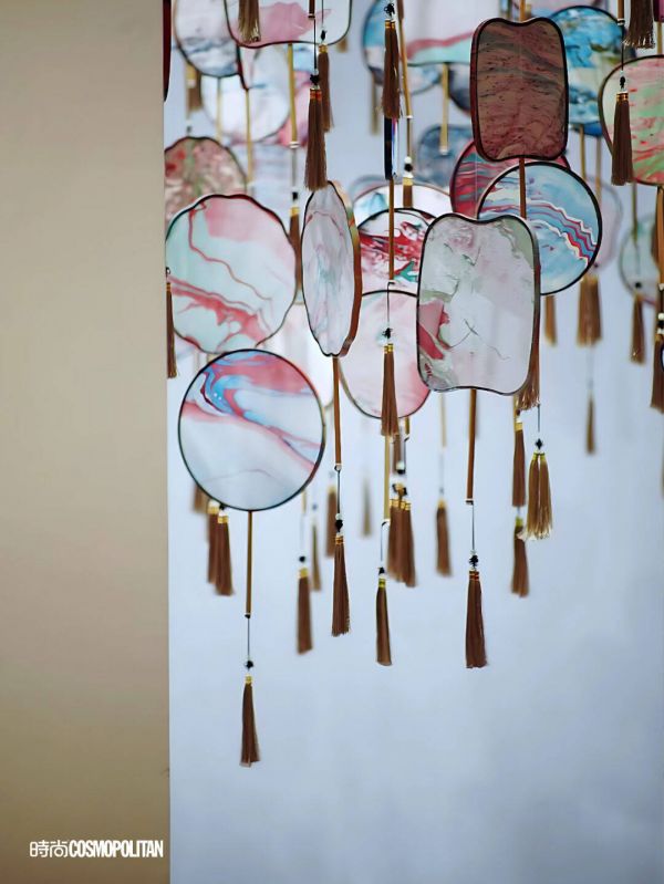 漂漆是以稀释剂调和大漆后,以点、甩、弹、划等手法,在水面绘出图案效果,凭借水面张力让色漆自由蔓延,形成随机的图案。所以,每一件漂漆作品都是独一无二的。刘琴抱着实验性地利用有机溶剂改变水面张力的趣味方式,完成了这件作品:不同的扇面的漆彩是我们缤纷的童年,下方则是木马和陀螺,穿梭其中的观赏者们虽然早已成了数字游民。