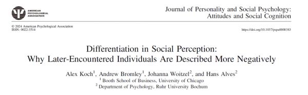 ▷ Koch, Alex, et al. "Differentiation in social perception: Why later-encountered individuals are described more negatively." Journal of Personality and Social Psychology (2024).