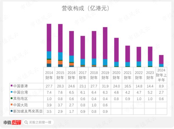 过去十年,虽迪生创建也在中国台湾、中国大陆、新加坡和马来西亚等地有奢侈品零售业务,但主要营收来源仍在中国香港,在香港以外的营收不断缩减。