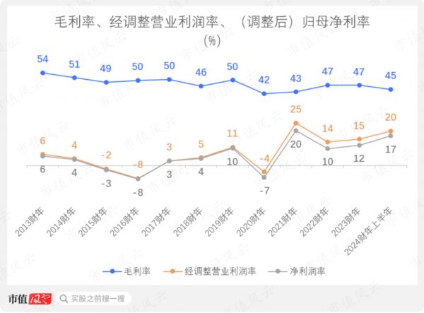 2023财年,公司的毛利率、经调整营业利润率、归母净利率分别为46.8%、14.8%、11.9%。