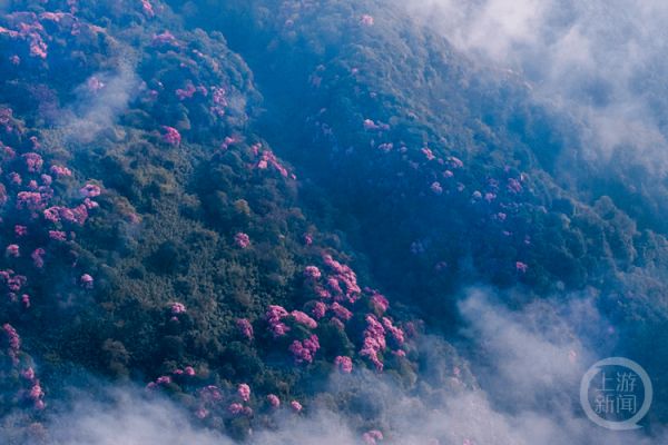 4月的晨曦里,重庆市南川区金佛山杜鹃花在云雾缭绕中初绽,清晨的阳光洒在金山寺与山路上。朦胧的群山静静地迎接着太阳升起,仿佛一幅人间仙境的图画。