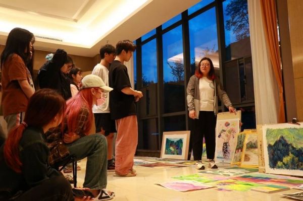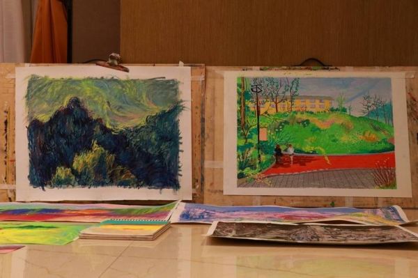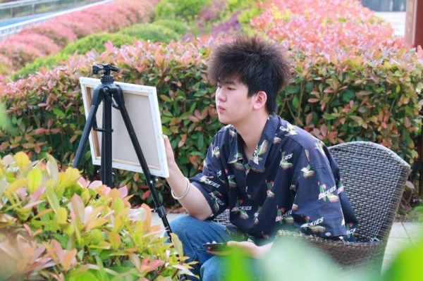 把创意融入生活,把诗意画上画板。雨后天晴的风光更让人惊叹,烂漫的春日,学生们纷纷拿上自己的画板到户外创作,蓝天、白云、和煦的春风与湖面交相辉映,随处可见的美景,他们在绿树下、湖边、廊下……三三两两的交流讨论如何立意构思,认真观察一草一花、一木一石,在画纸上肆意挥洒。