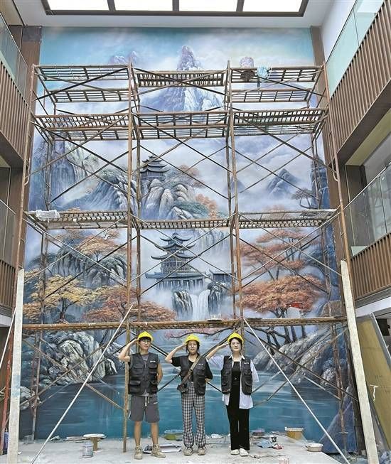 打开裴一凡、何珊、梁铭杰的社交平台,里面记录了他们三人去往各地创作的有趣视频。其中,有前往浙江普陀山附近创作千手观音浮雕的,有在清远乡村创作宫崎骏动漫墙绘的,有去福建龙岩创作浮雕龙的,有去江苏无锡绘制《千里江山图》的……每到一处作画,他们总会吸引不少人前来围观,这也增添了他们的职业自豪感。裴一凡说,壁画师这份职业让她把兴趣爱好变成了工作,虽然偶尔感觉到身体上的辛苦和劳累,但是她的心灵却感受到无比自由和快乐。