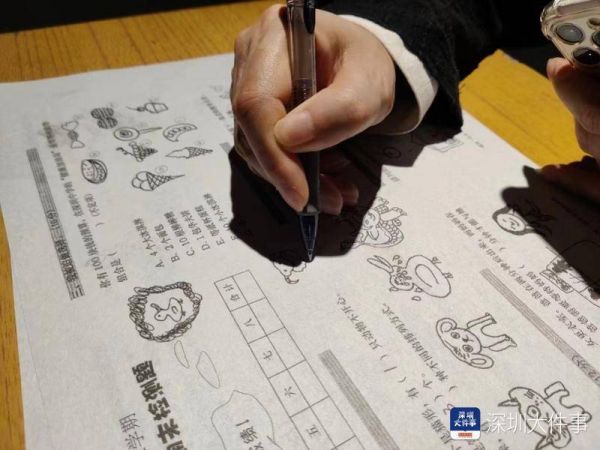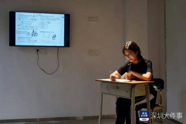 首次参加艺术展的邓沐澄是一位深圳中学的高二学生。她的参展作品《祝你取得好成绩!》,以装置绘画和影像的方式在U5一楼呈现,作品主要通过试卷、书桌、折纸与双屏录像等多种元素组合的形式呈现。通过重新编辑来自小学时期的试卷,作者试图借助内容和形式的变形,引发观众对学习方式和教育体系的思考,以及对固有观念的挑战,通过观众的参与和思考,推动对教育的深层反思及探讨。现场的纸质试卷除了展示还是可以跟观众互动的,可以写画和带走。在此作品中试卷已然成为媒介,小艺术家与来自鳌湖往事童年的自己对话。