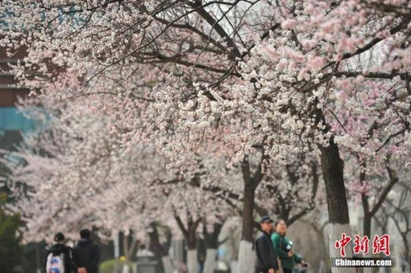 资料图:沈阳师范大学校园内盛开的桃花吸引人们前来赏花。中新社记者 于海洋 摄