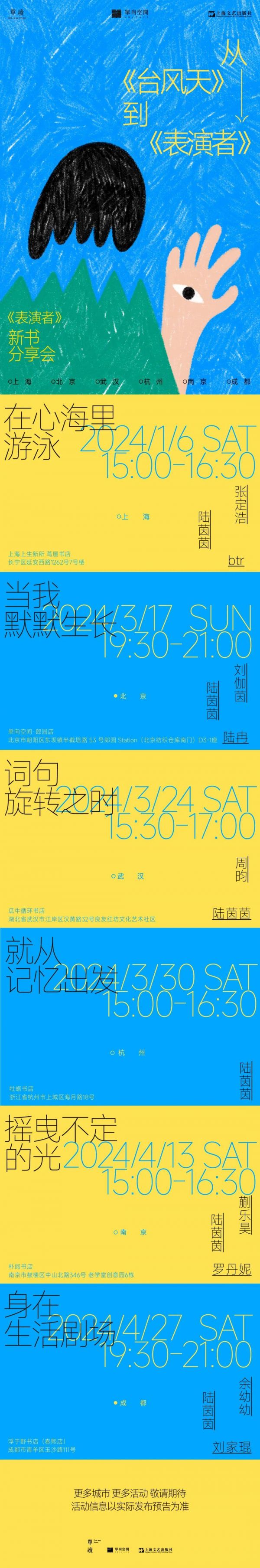4 月 27 日(周六)19:30,《表演者》作者陆茵茵,与诗人余幼幼,建筑师刘家琨一起来到成都的浮于野书店,讨论人身上似有若无的表演性在不同场景中是如何显现、延展和消解的。