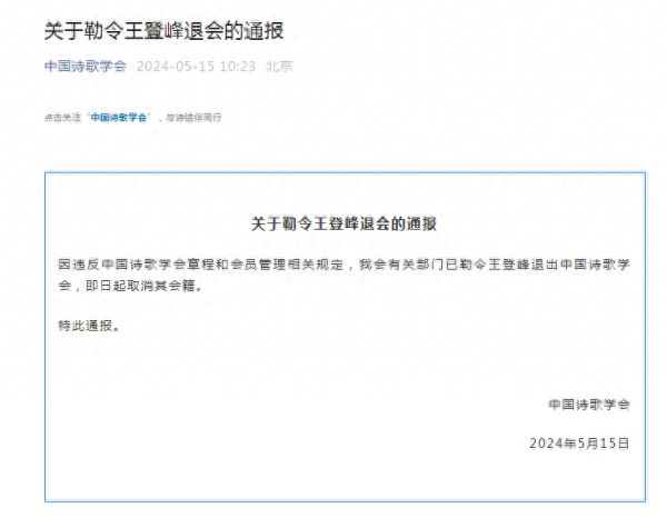 因违反中国诗歌学会章程和会员管理相关规定,我会有关部门已勒令王登峰退出中国诗歌学会,即日起取消其会籍。