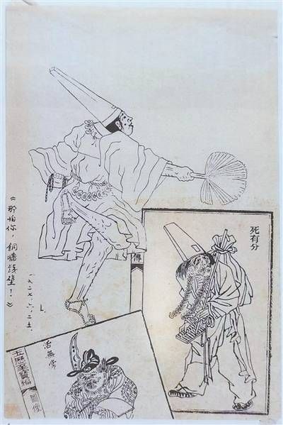 目连戏是绍兴地区的民间戏曲,在鲁迅的回忆散文中对目连戏有过详细的描述。《社戏》《五猖会》等篇章中生动地描写了他观看目连戏时的快乐。《无常》和《女吊》是目连戏中最精彩的两出。鲁迅还收藏了三种目连戏版本,曾经手绘了“活无常”。鲁迅在《无常》一文中称他为“勾摄生魂的使者的这无常先生”。目连戏是绍兴民众最喜爱的戏曲,其中的鬼卒、鬼王、活无常、死无常等角色都是由粗人和乡下人扮演的。鲁迅对他们的扮相有描述:“鬼卒和鬼王是红红绿绿的衣裳,赤着脚;蓝脸,上面又画些鱼鳞,也许是龙鳞或别的什么鳞罢,我不大清楚。鬼卒拿着钢叉,叉环振得琅琅地响,鬼王拿的是一块小小的虎头牌。据传说,鬼王是只用一只脚走路的;但他究竟是乡下人,虽然脸上已经画上些鱼鳞或者别的什么鳞,却仍然只得用了两只脚走路。”鲁迅还在《玉历钞传》上找出活无常的画像,这在他的《朝花夕拾》后记中就可以看到:“身上穿的是斩衰凶服,腰间束的是草绳,脚穿草鞋,项挂纸锭;手上是破芭蕉扇,铁索,算盘;肩膀是耸起的,头发却披下来;眉眼的外梢都向下,像一个‘八’字。头上一顶长方帽,下大顶小,按比例一算,该有二尺来高罢;在正面,就是遗老遗少们所戴瓜皮小帽的缀一粒珠子或一块宝石的地方,直写着四个字道:‘一见有喜’。”戏中竟还有无常嫂、无常少爷,可见这戏的喜剧性。