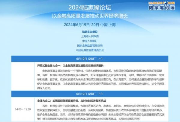 5月17日,证券时报记者从上海市委金融办获悉,由上海市人民政府和中国人民银行、国家金融监督管理总局、中国证监会共同主办的2024陆家嘴论坛,将于6月19日至20日在上海举行。