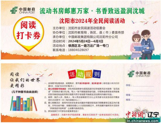 据了解,此次全民阅读活动主要包括图书展销、“阅读打卡”等内容。即日起至7月22日,将在全市各区、县(市)先后开展十四场活动,共建“书香沈阳”的生动局面正在形成。“此次活动将切实推进全民阅读活动,进一步打造‘书香沈阳’品牌,引导广大家长与孩子一起同阅读、共成长,在全社会形成爱读书、读好书、善读书的浓厚氛围。”沈阳邮政分公司活动负责人说。