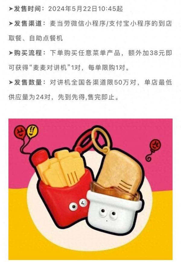 近日,知名连锁快餐巨头麦当劳推出了今年六一儿童节活动限量版玩具——“麦麦对讲机”,任意消费后加38元即可拥有两个形状分别为麦乐鸡块和薯条的对讲机、2张贴纸以及2根挂绳,限量50万个。该对讲机设计为卡通造型,可以手持,也可以挂在脖子上当挂饰,并且真的能够在300米内进行联络,实现对讲机的基础功能。