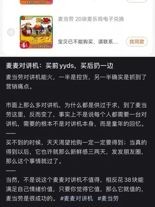 相比其他联名款玩具,此次以麦当劳自有的薯条和麦乐鸡为IP的麦麦对讲机究竟为什么能吸粉无数?从消费者角度来看,很多网友表示,是因为看到大家都在买了对讲机发朋友圈,自己也很想要。而本身对讲机带有的社交属性让自己想尝试一下是否能够正常使用,麦麦对讲机本身成为了一种社交线索,带给消费者极大的情绪价值。