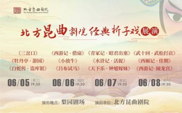梨园剧场6月5日将上演《三岔口》《牡丹亭·游园》《白蛇传·盗库银》;6月6日上演《西游记·借扇》《小放牛》《吕布试马》;6月7日上演《青冢记·昭君出塞》《水浒记·活捉》《天下乐·钟馗嫁妹》,6月8日上演《武十回·武松打店》《西厢记·佳期》《西游记·闹龙宫》,每天的剧目安排都是兼有文戏武戏,让观众可以充分领略昆曲艺术的博大精深。