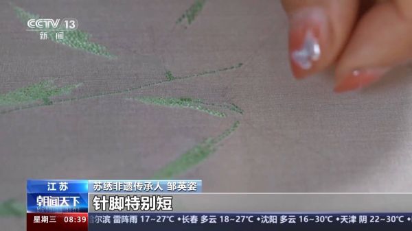 苏绣非遗传承人 邹英姿这种从传统中走来的针法针脚特别短,间距在0.2毫米至0.3毫米。大家可以看到,滴滴绣之间有呈颗粒状的空隙,给人一种可以呼吸的感觉。