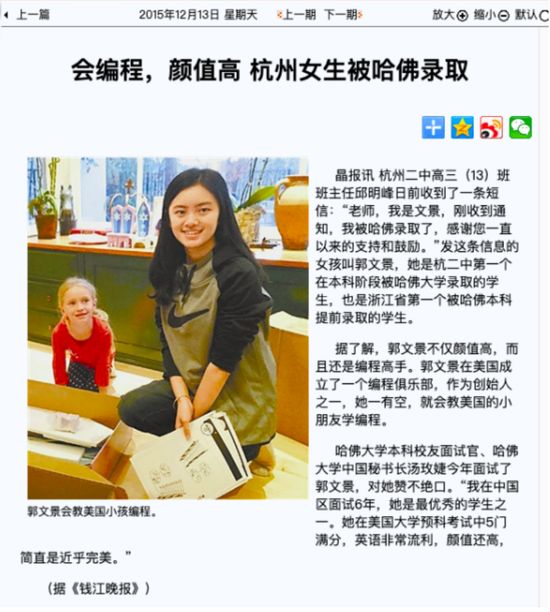 而早在八年多以前,郭文景就曾因“高颜值学霸”走红。八年前,杭州二中2016届毕业生郭文景拿到了哈佛大学的录取通知,她也是杭州第二中学第一个在本科阶段被哈佛大学录取的学生。