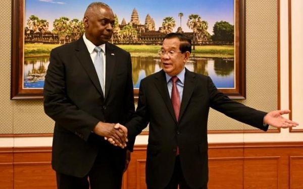▲当地时间2024年6月4日,柬埔寨金边,柬埔寨参议院主席洪森会见到访的美国国防部长奥斯汀。图/IC photo
