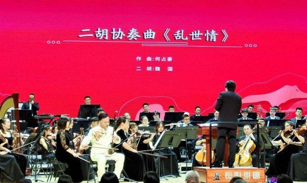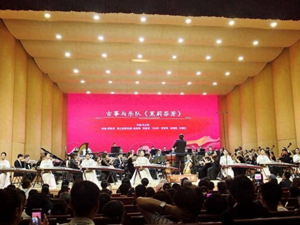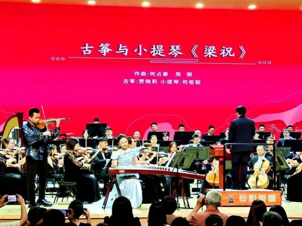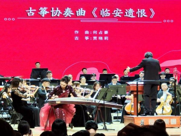 在音乐会中,贾晓莉与长影乐团、羽之韵筝乐团联袂演绎了何占豪先生作曲的《茉莉芬芳》《临安遗恨》等古筝名曲。现场还演奏了管弦乐《胡腾舞曲》《伊犁河畔》、二胡协奏曲《乱世情》等多部何占豪创作的经典作品。