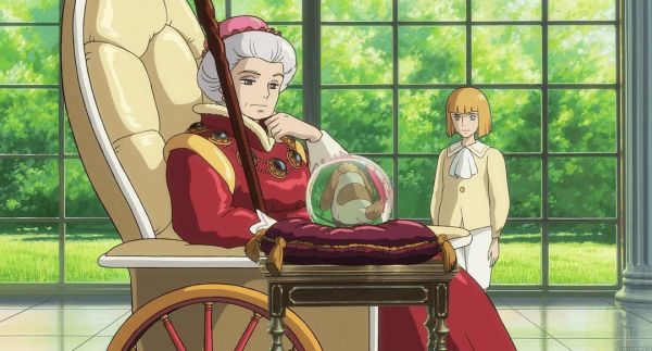 宫崎骏细细描摹苏菲遇见萨丽曼的过程:要攀沿高高的台阶,穿过富丽的宫殿、肃立的卫兵、幽深的甬道,豁然来到静谧的一座玻璃宫殿,萨丽曼优雅地坐在草木舒展翠绿如潭的窗畔,隐喻她是拥有国家权力的幕后主宰者,亦是神秘事物的持有者。萨丽曼拥有至高的巫术、权力,不仅操控王室命运,也希望哈尔按照她的方式,忠诚于王室,参加国家战争,并继承自己的地位。