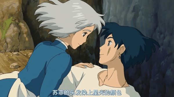 当苏菲跋涉到萨丽曼的玻璃宫殿,勇敢向萨丽曼陈述战争的残酷,坚定地说出「不」,魔咒在某一刻解除,苏菲变回年轻的样子,这不仅仅是苏菲从衰弱避世的心变得勇敢活力的征象,也是对哈尔的镜映:处于爱,处于保护,也出于对哈尔的选择心生理解、尊重、激赏之坚定,她年轻闪亮的面容回应着哈尔的真我。