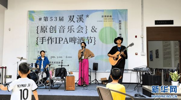 夏日午后,阵雨初歇。屏南双溪古镇原创音乐会现场,陈说和两个伙伴在台上表演,随性洒脱。舞台下,观众们一边欣赏精彩表演,一边品尝着当地的精酿啤酒,气氛热烈。