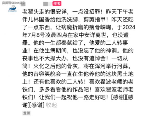 赵本山爱徒翟波离世,选择河葬显豁达人生