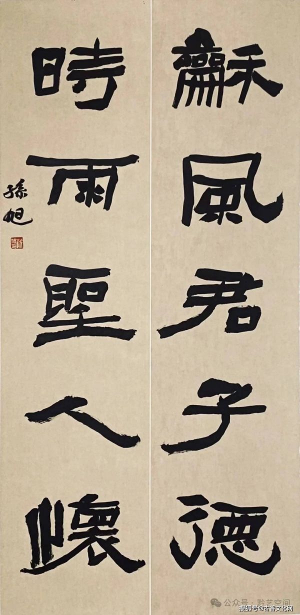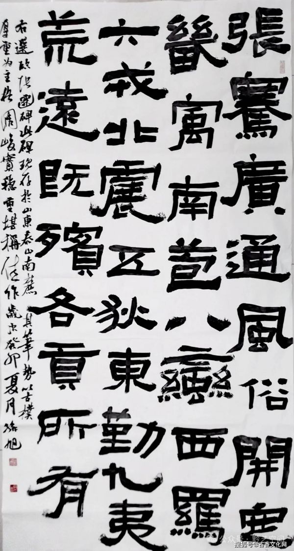 孙旭早慧,能于传统精神与现代形式相融会,书多大字以适于展览,讲风骨讲气息讲格调体现内养。隶书多取法《张迁碑》《鲜于璜》《西狭颂》《石门颂》等摩崖碑刻,然兼收并蓄、博采众长,不囿于一家面目,非高人点拨不能至也。孙旭常言感恩吴耀和李锐两位恩师,其自小跟随著名书法家吴耀先生学艺,打下了坚实的笔墨基础。大学毕业后,从事书法教育工作,教学相长,促进了真草隶篆各种书体实操和书学理论的精进。