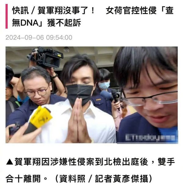 9月6日,据台媒,贺军翔被女荷官控性侵一案因无实际事证获不起诉。日前,台北地检署传唤贺军翔以及相关人士,进行相关人物对证和物证检验后,没有发现男性DNA,因查无实际事证,贺军翔获不起诉。