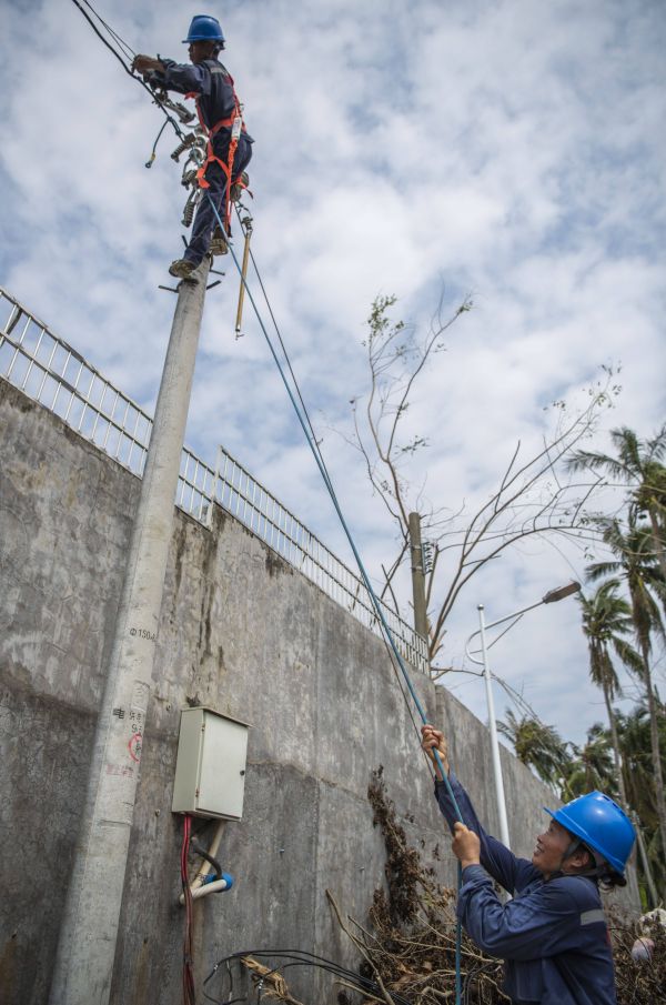 9月15日,海南省文昌市清澜镇,电力工人抢修台风损毁的供电线路。新华社发(蒙钟德摄)