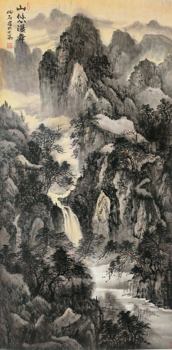 伯石先生画的水墨,同时他又加入了他的散墨技法,使画面远近虚实表现得淋漓尽致,白雪石先生就说过:我兄弟这样的作品连我都画不出来,玩水墨玩的这么高级,真是太厉害了。