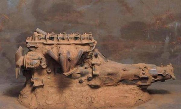 画中的发动机横躺在画面中,暗黄色的金属表面被厚厚的灰尘覆盖,仿佛经历了岁月的无情洗礼。