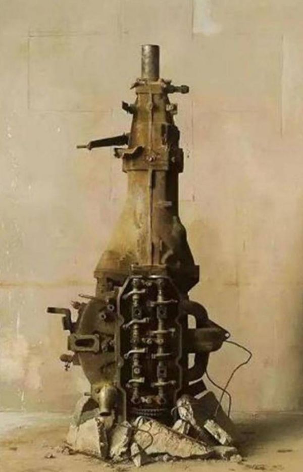 1998年,冷军创作了他标志性的作品《文物—新产品设计》,这幅作品的灵感,来源于他偶然间在一个废品回收站,发现的一台破旧的发动机。