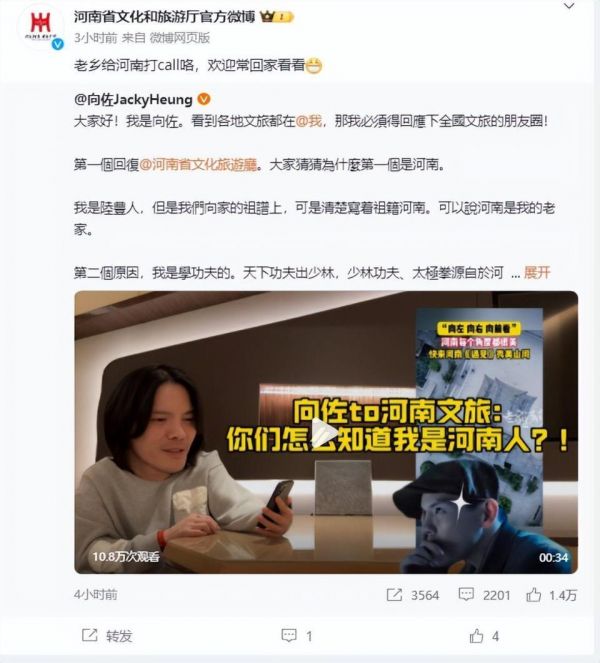 10月17日,向佐最新发文回应被各地文旅朋友圈玩梗,其中第一个回复河南省文旅厅: