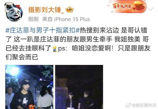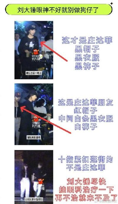 刘大锤刚开始说自己拍到庄达菲与男子十指紧扣街头吃辣条,一晚转场两家酒吧。随后,刘大锤发博称是自己认错人了,已经去挂眼科了。