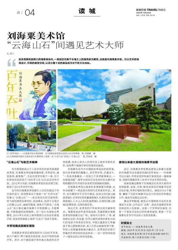 延安西路凯旋路口的海粟绿地内,一座如巨石磐于云海之上的建筑极为醒目,这就是刘海粟美术馆。它以艺术的场馆设计、开阔的展览空间,以及分量十足的展品成为长宁区文化地标。