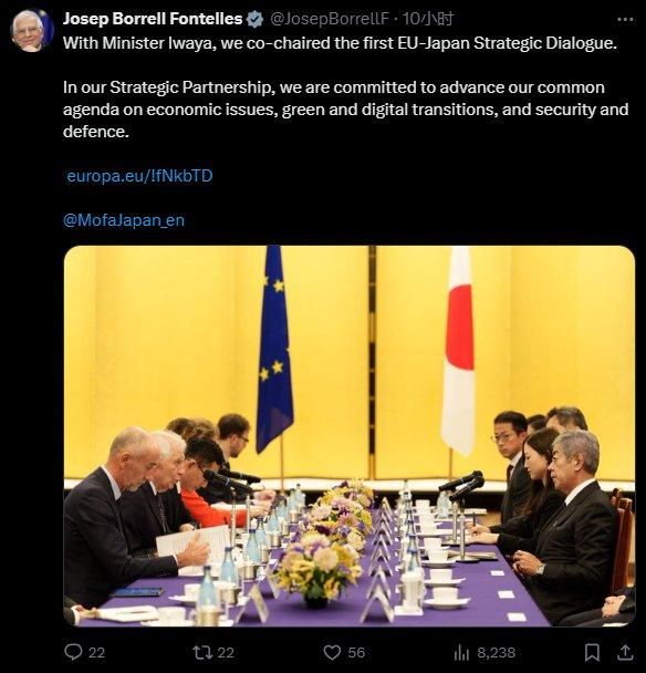 【文/观察者网 齐倩】当地时间11月1日,欧盟外交与安全政策高级代表兼欧盟委员会副主席博雷利访日,在东京与日本外相岩屋毅举行首次欧日外长级战略对话。期间,双方宣布建立欧盟-日本安全与防务伙伴关系,签署包括加强安保合作等内容的“安全保障及防卫伙伴关系”协议文件(下称“文件”)。