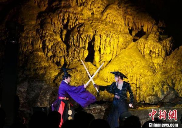 2024桂林艺术节期间,改编自鲁迅先生的同名短篇小说、取材于古代志怪小说“三王墓”这一奇幻传说的话剧《铸剑》在桂林的岩洞中上演。图为10月29日剧目在岩洞的演出现场。蒋丰慧 摄