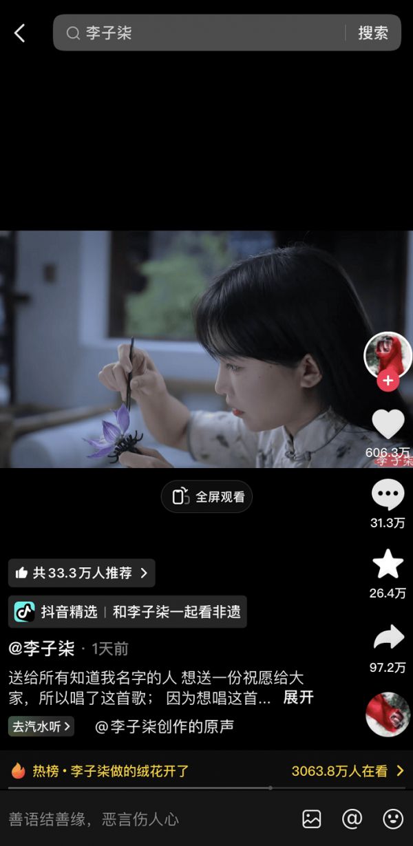同时,平台也在大力扶持传统文化的相关内容。例如抖音平台就发布了“百young非遗计划”,李子柒作为该计划的首位宣推官,将与其他创作者一起致力于推动非遗项目的挖掘与传播。李子柒还携手多位非遗传承大师共同成立了“李子柒非遗工作站”,为传统文化的传承与发展贡献自己的力量。