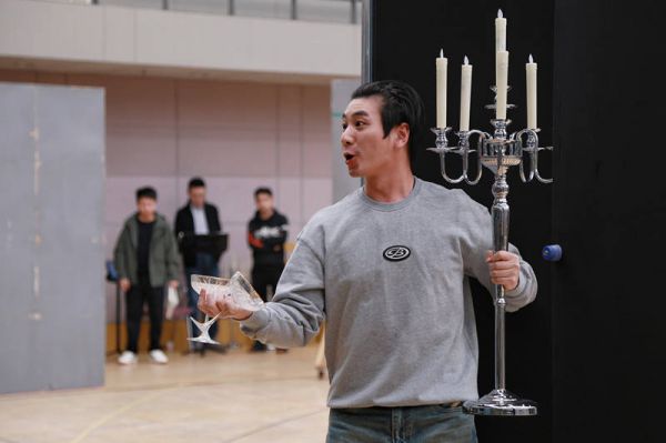 开场,蔡程昱饰演的阿尔弗莱德举着蜡烛来找昔日情人罗莎琳德约会,小夜曲一唱,满满的“维也纳风格”,优美动人。宋元明饰演的罗莎琳德面对旧情人纠缠表现出的无奈与纠结令人捧腹。而艾森斯坦与布兰德律师的激烈争吵,充满了喜感与张力;女佣阿黛莱为了参加舞会而费尽心思“请假”,古灵精怪的神情令人忍俊不禁。后续种种误会也给现场媒体留下深刻印象,排练厅中不时传出阵阵欢笑,让人深刻感受到了《蝙蝠》的喜剧魅力。
